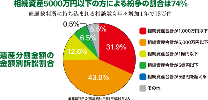 また、相続はお金持ちだけの問題という誤った認識が、一般家庭の相続準備を怠り、問題を複雑にしています。実際、司法統計年報(平成22年度版)によると、紛争件数の74%が相続税と関係ない5000万円以下の遺産分割で揉めています。遺産が多いから揉めるのではなく、100人いれば100通りの相続があり、どこの家庭にも、きちんと相続に対しての準備と助言が必要な時代です。